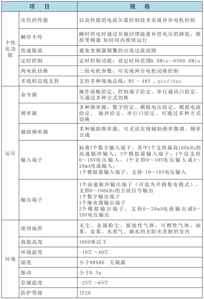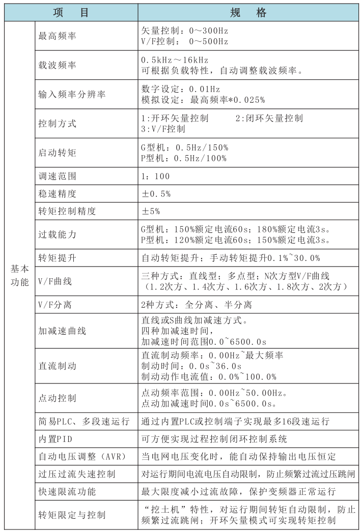 输入电压:三相AC380V。 功率范围:0.75~315KW。 过载能力:G型机:150%额定负载60s,180%额定负载3s。 P型机:120%额定负载60s,150%额定负载3s。 控制方式:VF、无PG矢量。 驱动电机:普通异步电动机、变频异步电机。 GP机型 :支持GP合一。 特点一、高输出&高性能① 转矩和速度控制高响应 1.1 无PG开环矢量控制下,转矩响应<20ms。有PG闭环矢量控制下,转矩响应<5ms。 1.2 适用快起快停、突加突卸负载的场合。